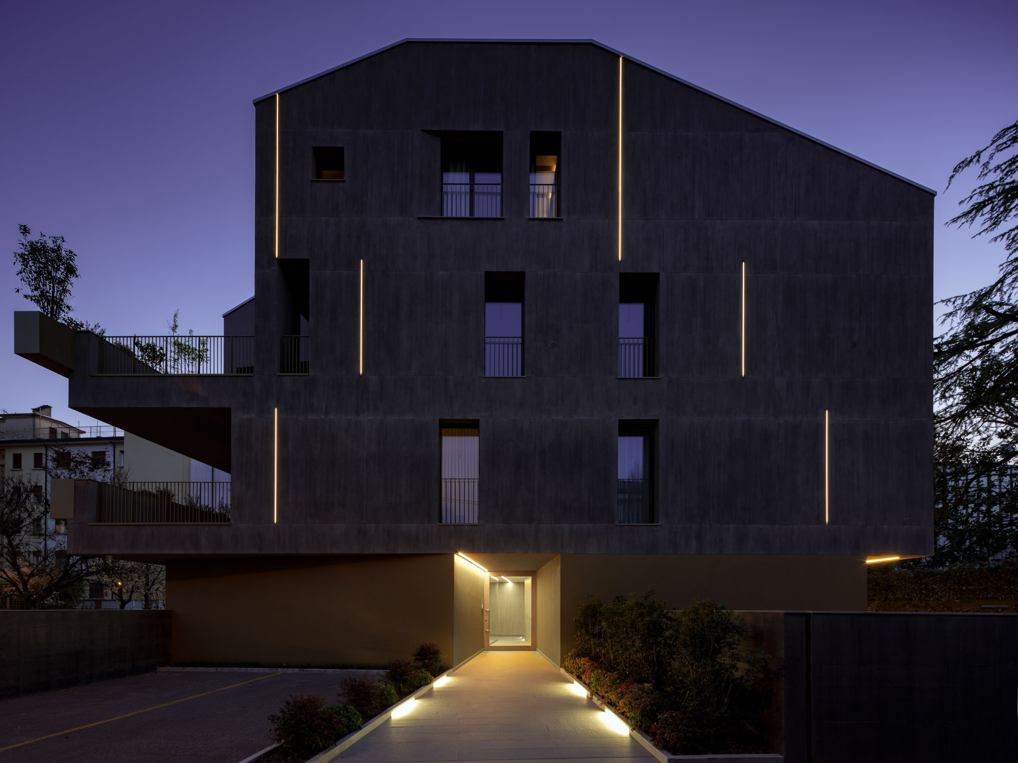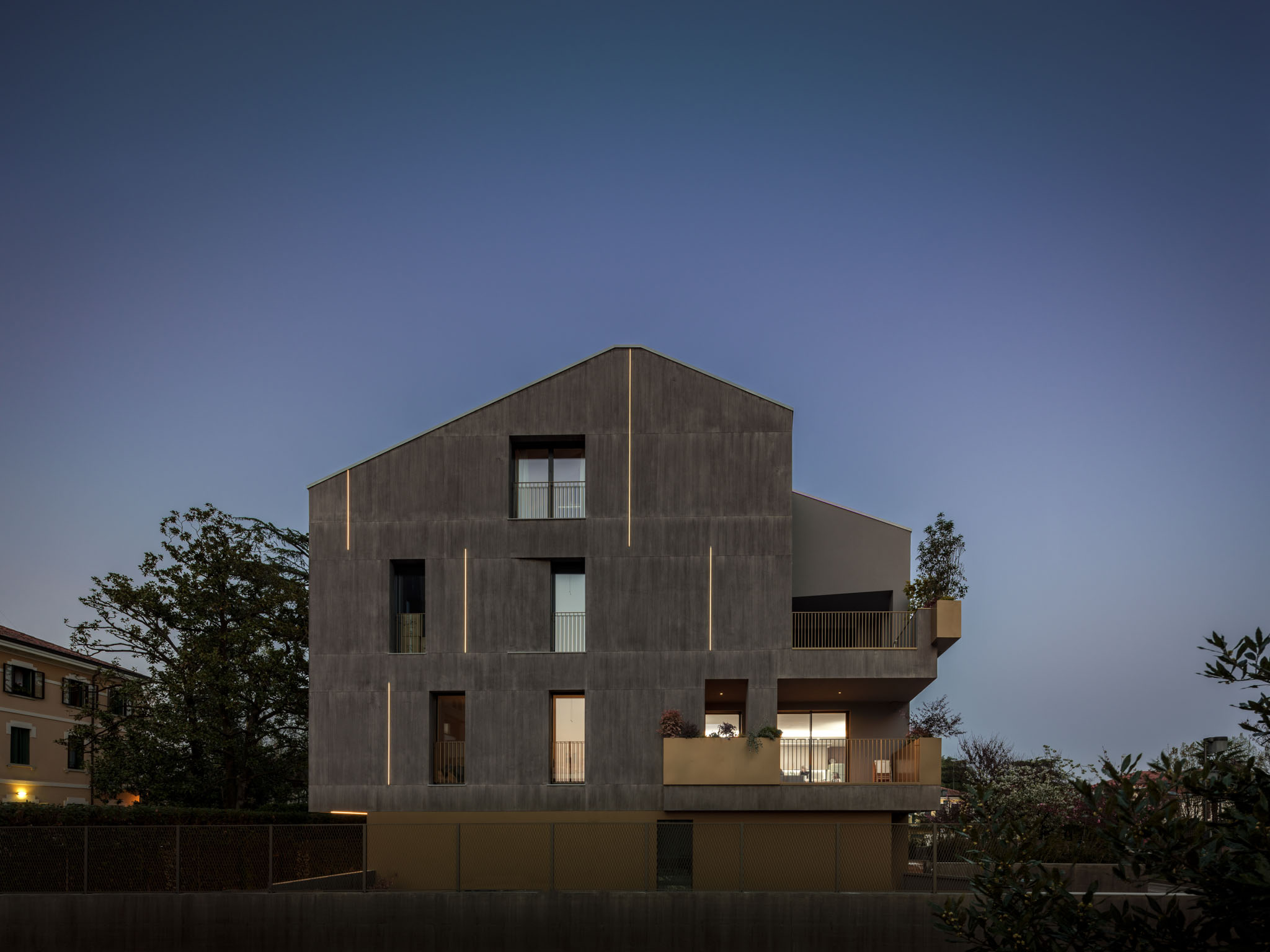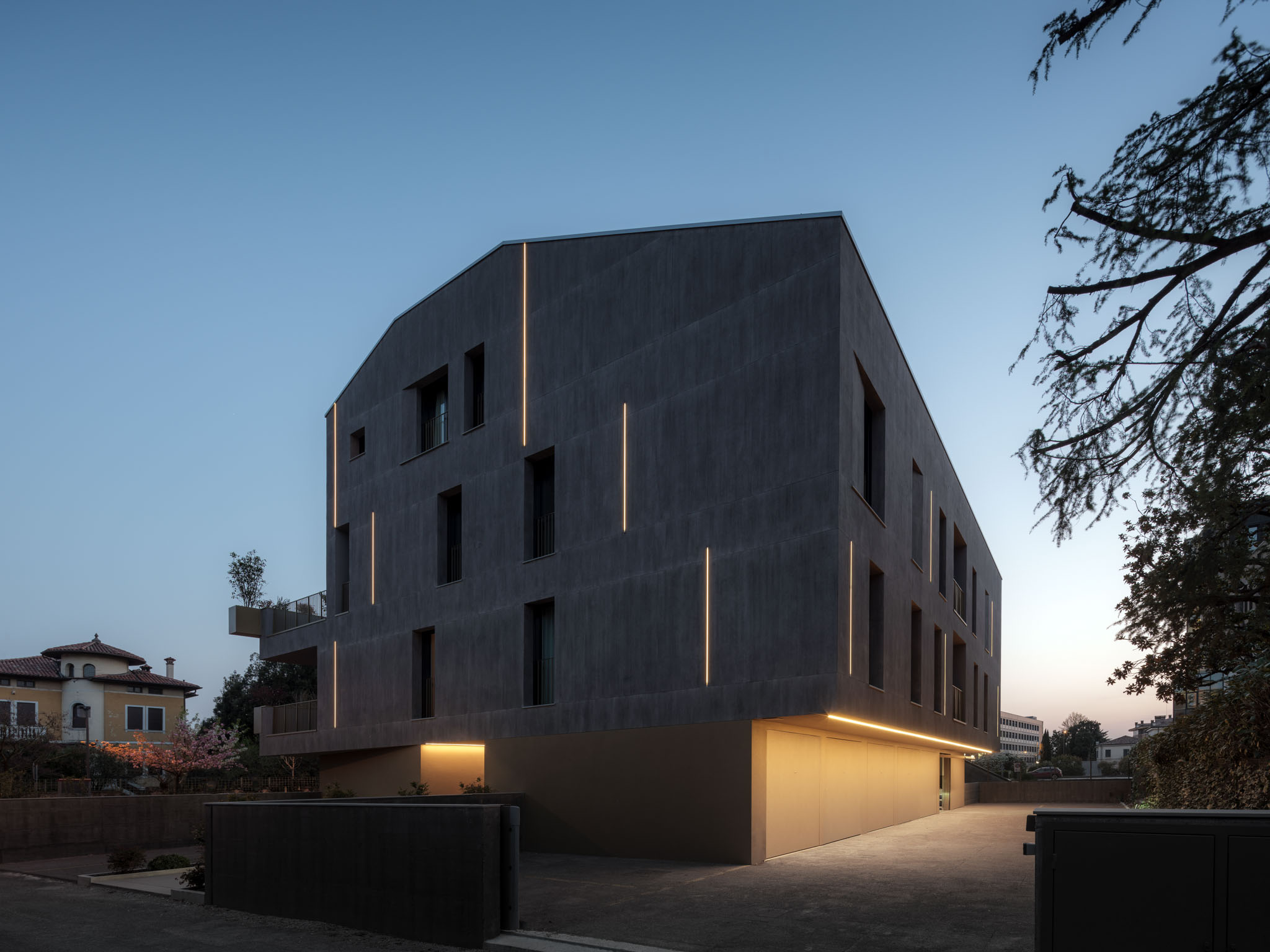 I nuovi volumi residenziali nelle periferie delle cittadine padane oggetto del cosiddetto ‘piano casa’ sono ampliamenti volumetrici di edifici preesistenti non più funzionali. Si iniziano a configurare quindi nuovi tipi di residenze che definiscono la loro tipologia sulle attuali esigenze abitative e d’uso. Il volume edificato si presenta compatto, composto da un basamento corrispondente al piano terra e, ai piani superiori scavato negli angoli, da ampie logge e terrazze, necessarie a creare un dialogo con il prospiciente viale Verdi, nella logica di ribadire la vocazione verde di questo brano di città fuori mura. L’edificio si compone di un basamento, di una facciata e di un coronamento, come nelle regole dell’architettura. Il basamento è rivestito con il colore ‘ottone satinato’ ad evidenziare la parte di attacco a terra. La facciata è intonacata e dipinta tramite la tecnica tradizionale della velatura, adottando un colore grigio piombo che volutamente contrasta con il basamento ed enfatizza i caratteri architettonici dell’intervento. La facciata inoltre gode di un gioco di ‘ondulazione’ a fasce orizzontali, generato da sguinci che raccordano i fori finestra alla superficie esterna nel tentativo di rappresentare lo spessore del muro perimetrale. Una sorta di scavo che modula la superficie delle facciate rompendo la coerenza della planarità.